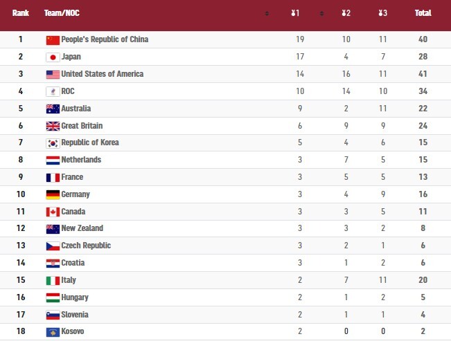 وتتصدر الصين الترتيب العام برصيد 40 ميدالية (19 ذهبية، 10 فضية، 11 برونزية)، وفي المركز الثاني تأتي اليابان برصيد 28 ميدالية (17 ذهبية و4 فضية و7 برونزية)، وتليهما الولايات المتحدة في المركز الثالث برصيد 41 ميدالية (14 ذهبية و16 فضية و11 برونزية)