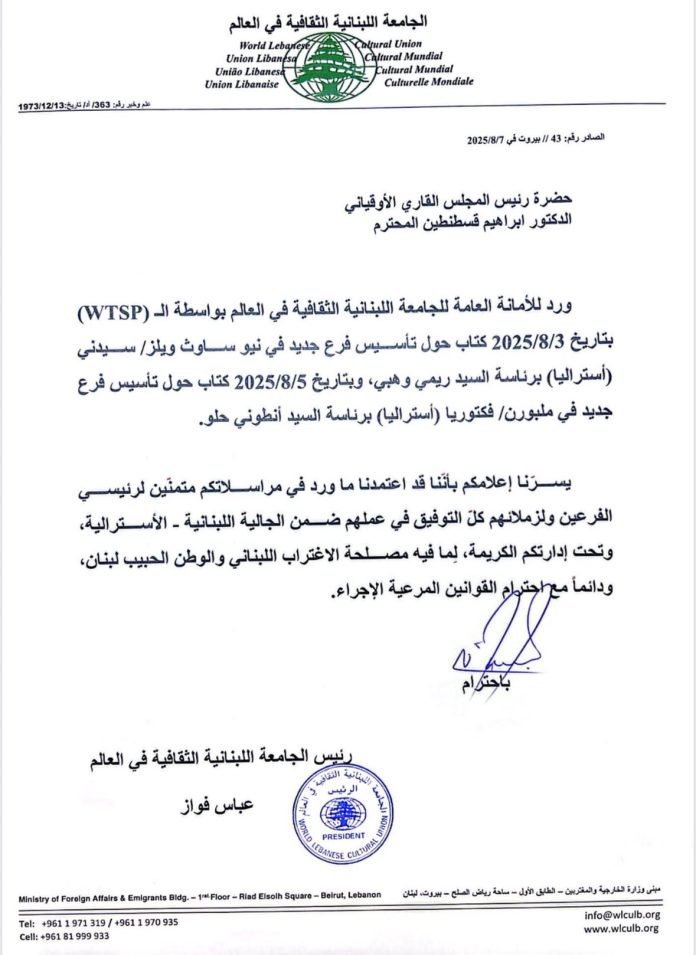 بالإضافة إلى ذلك تمنت ” كل التوفيق لرئيسَيّ الفرعين ولزملائهما في عملهم ضمن الجالية اللبنانية-الأسترالية،